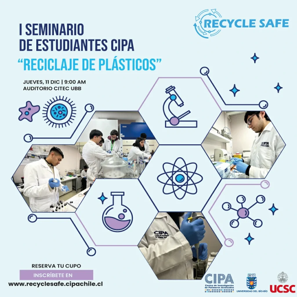 El Centro de Investigación de Polímeros Avanzados (CIPA) tiene el agrado de invitarles a participar en el Primer Seminario de Estudiantes CIPA: “Reciclaje de Plásticos”, realizado en el marco del proyecto Recycle Safe, iniciativa orientada al desarrollo de soluciones innovadoras para el reciclaje seguro y sostenible de materiales poliméricos.